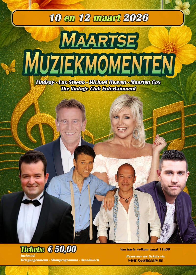 | 12 MAR 2026 | Middagshow: Maartse Muziekmomenten | De Kaasboerin, Eerselseweg 99, 2400 - MOL-POSTEL, BE | 11:00 | |