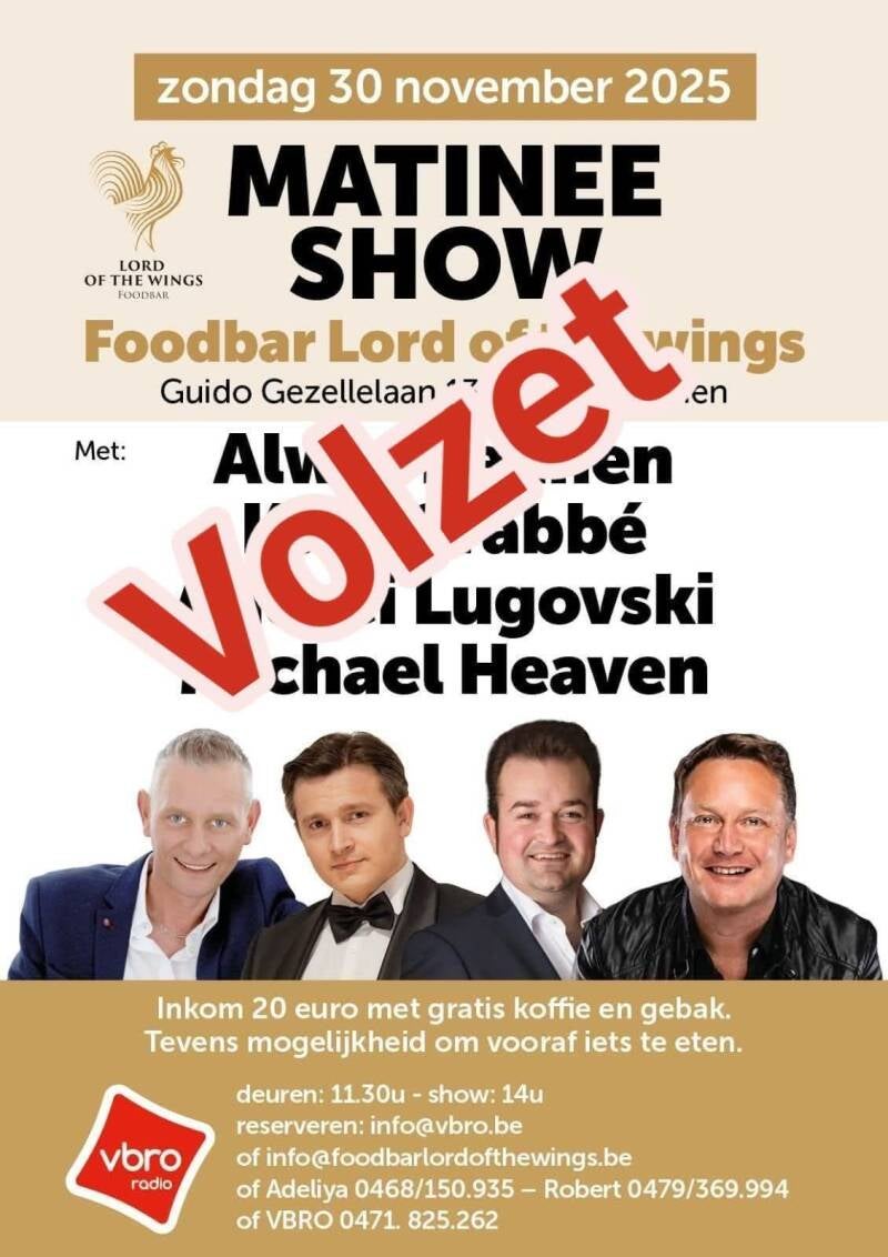 | 30 NOV 2025 | VBRO Matinee Show (VOLZET!) | Foodbar Lord of the Wings, Guido Gezellelaan 137, 8930 - MENEN, BE | 14:00 | Reserveren via VBRO info@vbro.be of 0471/825 262 |