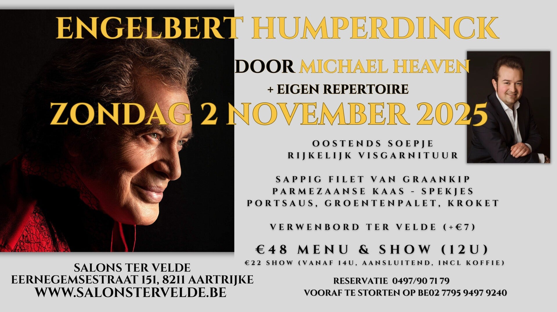 2 NOV 2025 | A Tribute to Engelbert Humperdinck & More by Michael Heaven | Salons Ter Velde, Eernegemsestraat 151, 8211 ZEDELGEM, BE | 16:00 | www.salonstervelde.be |